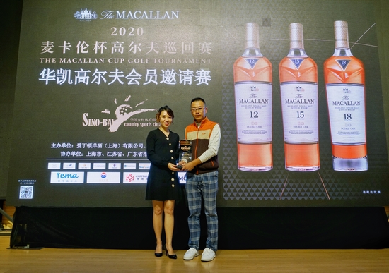 颁奖晚宴上,上海市高尔夫球协会副会长王锦培先生、爱丁顿洋酒(上海)有限公司麦卡伦品牌代表蓝亦雯女士、华凯乡村体育俱乐部总经理夏永斌先生为各大奖项的获得者送上奖杯与奖品: