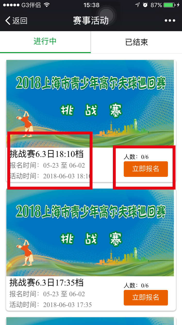 挑战赛预约方法:请在微信内添加“上海高尔夫球训练中心”公众微信号,点击下方中间“报名参赛”内,“挑战赛报名”,进入后,自行选择相应日期时间档(5月26日、5月27日、6月2日 6月3日仅限ABC组预约),首次需通过手机号登录,填写对应信息,并在备注中填写组别与性别后提交,并付款。报名成功!