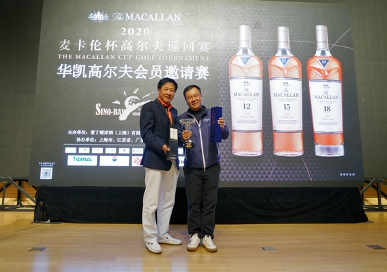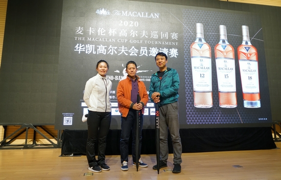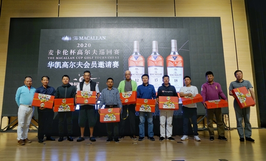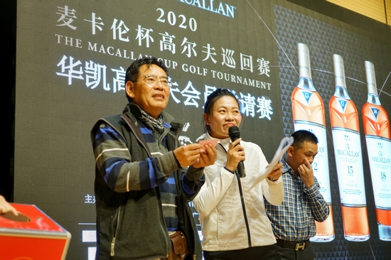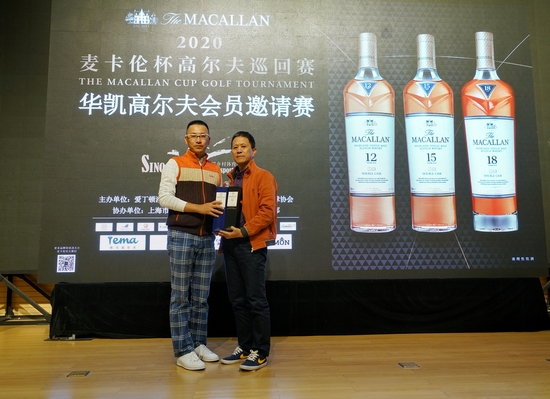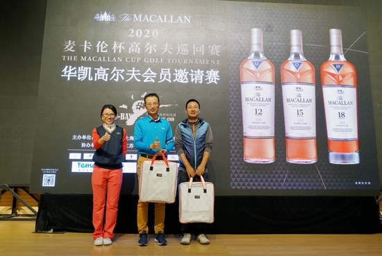 颁奖晚宴上,上海市高尔夫球协会副会长王锦培先生、爱丁顿洋酒(上海)有限公司麦卡伦品牌代表蓝亦雯女士、华凯乡村体育俱乐部总经理夏永斌先生为各大奖项的获得者送上奖杯与奖品: